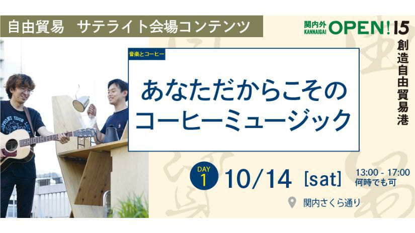 関内さくら通りで同時開催するさくら通りOPEN!!に音楽とコーヒーを楽しめる屋台カフェを出店します。コーヒーを準備する間に対話を楽しみながら小休憩ができます。横浜を拠点に活動している2組のアーティスト(菅野翔太・あおしぐれ)が、ライブハウスからまちに飛び出し、あなたとの対話から即興で作曲し、披露をします。